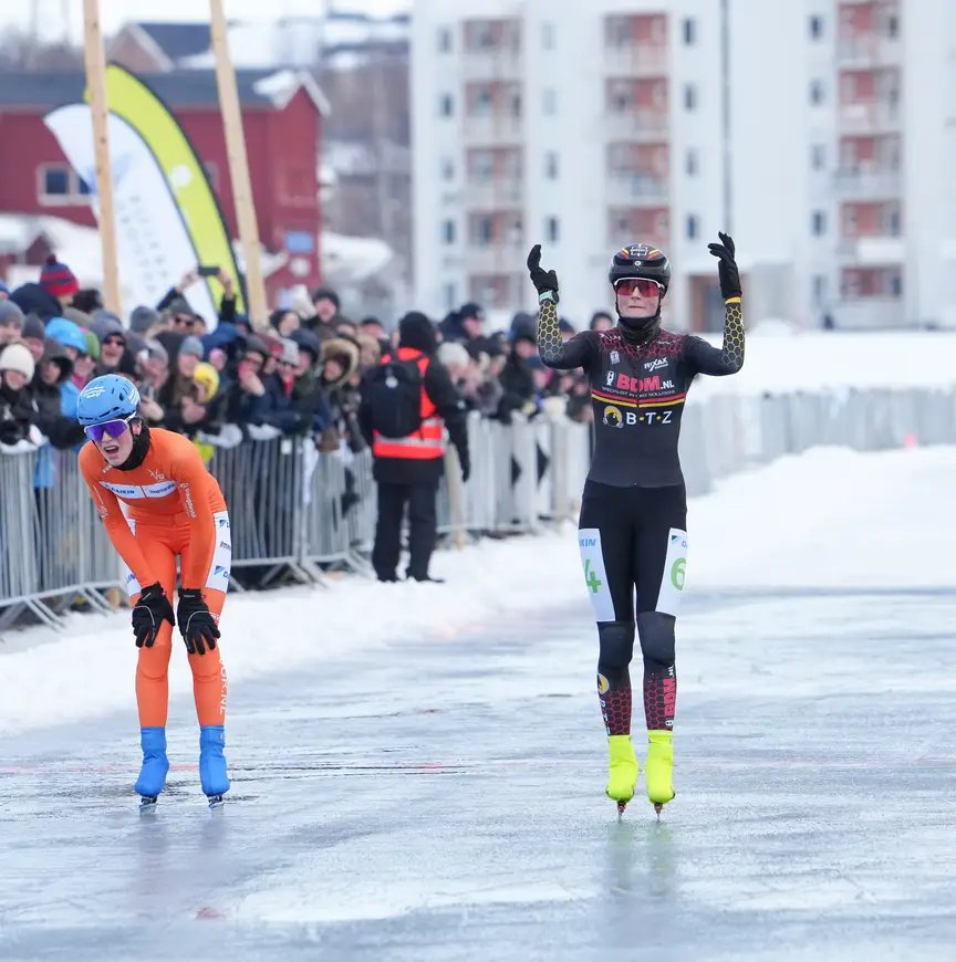 Snoek legde zich rap neer bij de tweede plaats. “Ik heb veel kopwerk moeten verrichten, omdat Esther niet meer mocht helpen. Daar baalde ik een beetje van. Als je dan zo lang aan de leiding moet rijden, heb je de snelheid niet meer voor de sprint.” “Ach”, voegde ploegleider Dennis Pont eraan toe, “BDM-BTZ heeft het slim aangepakt. En Tessa neemt een paar belangrijke punten mee voor het klassement waarin ze haar koppositie wat verstevigt.” Snoek staat zes punten voor op Bosma. Zondag is de afsluitende race in Luleå, dan over 100 kilometer.