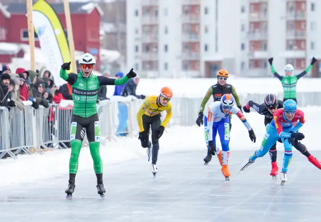 “Het werkt. De communicatie tussen ons twee verloopt goed,” Hoolwerf verfijnde zijn antwoord. “Het werkt binnen de ploeg sowieso lekker. Het komt er dit seizoen niet altijd uit qua aantal overwinningen, maar als we erbij zitten voorin, dan blijkt dat we het kunnen afronden, dus dat we best goed zijn”, besloot hij, nog even nagenietend van de barre condities. Hoewel de dooi zijn intrede had gedaan, hield de ijsvloer zich wonderbaarlijk goed. “Die bakken wind voorspelden niet veel prettigs, maar het ijs was fantastisch. In de tweede ronde heb ik tegen iedereen in de kopgroep geroepen: dit is toch niet normaal? We rijden hier voor het windje over een schitterende plaat zwart ijs, zonder op de scheuren te hoeven letten want die waren vannacht allemaal dichtgevroren door het water dat erop was gelopen. Een vol Thialf is mooi voor de sfeer, maar hier kan niets tegenop.”