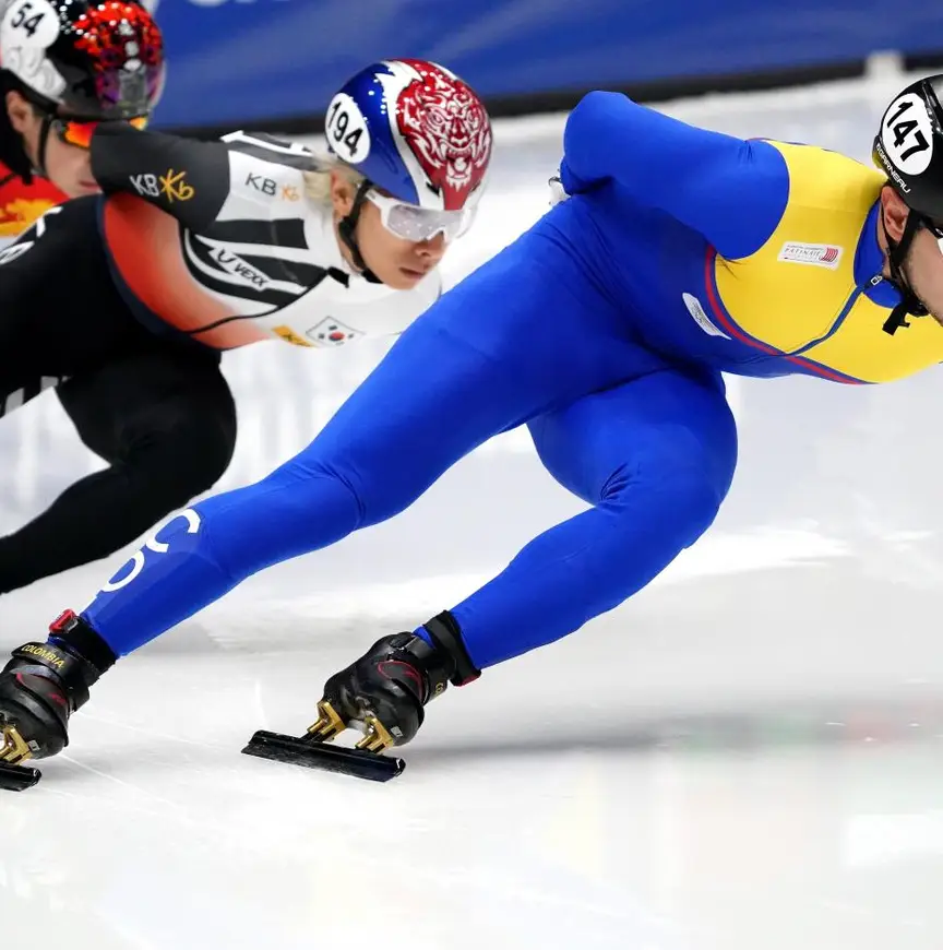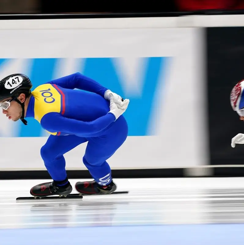 Colombia is voor ons Nederlandse schaatsliefhebbers, het land van de inliners. Voor de enige Colombiaanse deelnemer in Dordrecht, Nicolas Laborde (op de foto in het geel-blauw), geldt dit net zo goed (hij was degene die samen met Itzhak de Laat in de kussens belandde op de 500 meter). “In Colombia sta ik bekend als de jongen die als inliner shorttracker werd. Momenteel woon ik zeven jaar in Calgary. Als junior zat ik tegen het niveau van het nationale inline-team aan, maar ik wilde na de middelbare school naar het buitenland. Mijn oom woont in Montreal, dus ik besloot daar naartoe te gaan. Tijdens de inline-trainingen die ik daar voortzette, kwam ik in contact met een aantal shorttrackers. Één van hen was Valérie Maltais (succesvol Canadees shorttrackster en nu actief als langebaanschaatsster, red.). Zo maakte ik kennis met shorttrack. In mijn land heb je geen ijsbanen; als je wilt schaatsen, moet je naar het buitenland."