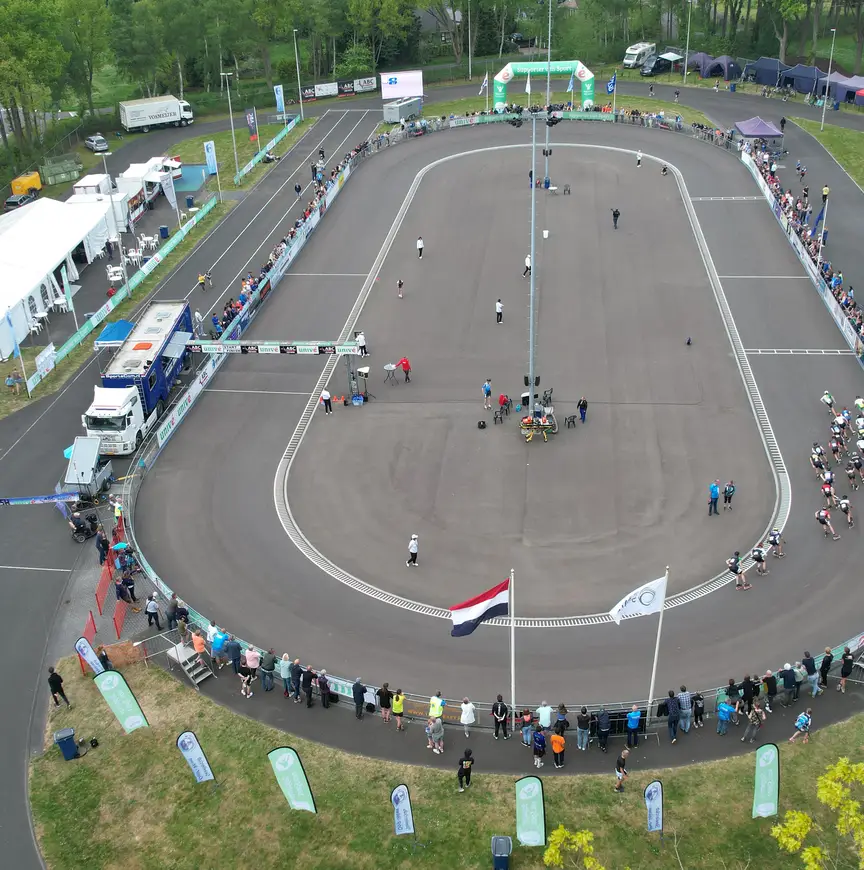 Het is voor de mensen van Skeelerclub Oost Veluwe in Heerde de tiende keer dat ze de Europa Cup organiseren. Dat is meteen te merken aan de verkeersregelaars die de automobilisten op routine naar de juiste plekken verwijzen op het naastgelegen grasveld. Enkele inlineskaters komen op de fiets aangereden met hun skeelers geknoopt aan de buitenzijde van hun tassen. Rondom de Bertus Dokter piste is door vrijwilligers al dagen gewerkt aan de aankleding van het terrein. Vlaggen, banners, tenten en catering. Voor aanvang van de wedstrijd wordt nog snel een laatste hand gelegd aan de baan. Met wit tape wordt er met secure een tweede lijn getrokken bij de start voor onder anderen de 200 meter ‘dual sprint’.