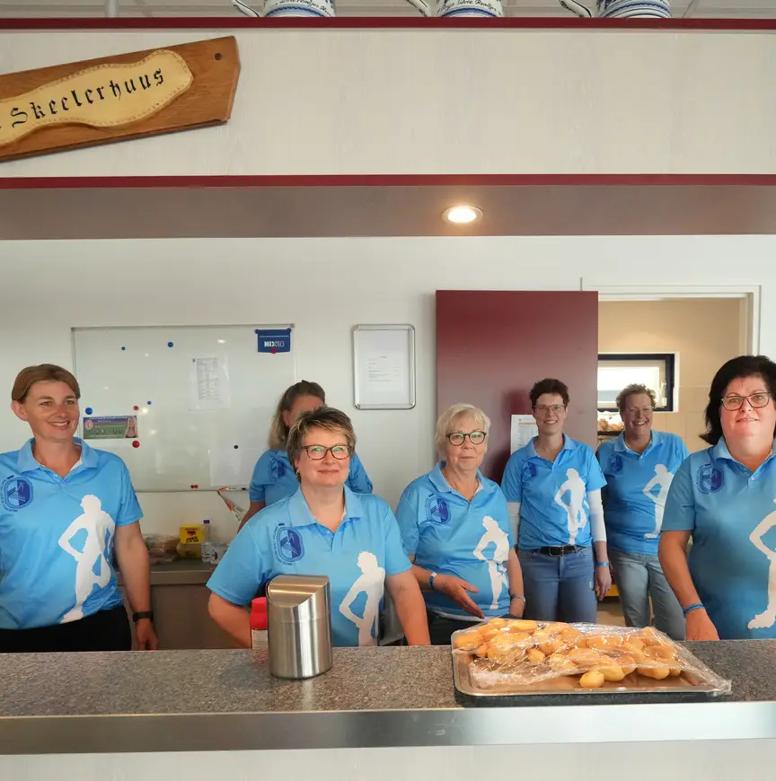 Berty Wolff en Yvonne Roosenboom (ja, de moeder van) ontvangen enthousiast de vrijwilligers, VIP’s en pers in ‘t Skeelerhuus. Zij zorgen samen met andere vrijwilligers van de club dat het niemand aan iets ontbreekt. Wolff: “Sinds mijn man Jannes in het bestuur zit, ben ik hier al actief als vrijwilliger. Dat is meer dan vijfentwintig jaar. Nagenoeg bij alle wedstrijden en evenementen zijn we hier om kantinediensten te draaien.” Roosenboom vult aan: “Berty is het hoofd hier”, die meteen bescheiden wordt tegengesproken door Wolff. “Nee, nee, zo wil ik me niet voelen. Ik ben het aanspreekpunt.”