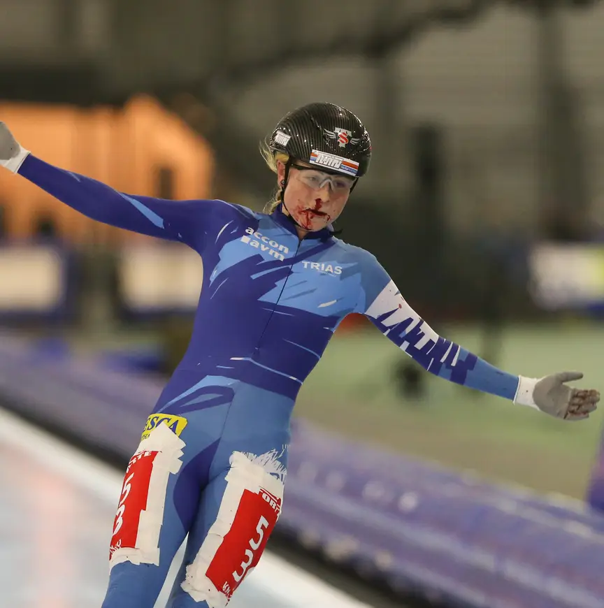 Ze leek op de finish zo weggelopen van het slagveld. Bloed liep bij Groenewoud over haar lippen en kin, een rood spoor op haar pak. Ook de ijsvloer van Kardinge toonde rode vlekken. De zeventienjarige schaatsster uit Hallum reageerde schouderophalend. ’’Ik heb het overleefd en nog goud op de koop toe.’’