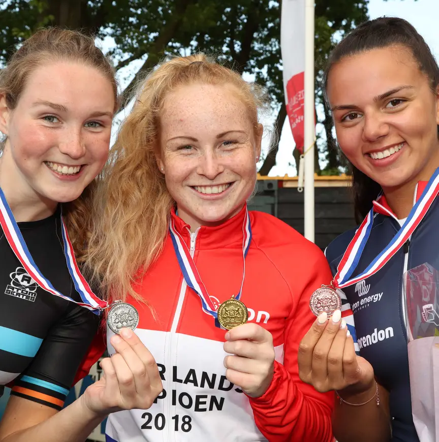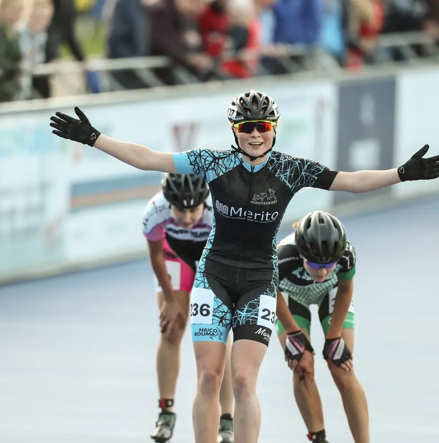 Ze glundert als naar haar rood-wit-blauwe trui kijkt. Ze had er al eens eentje bij het NK op de weg gekregen, maar nog nooit bij een wedstrijd op de baan. Truitjes zijn namelijk alleen te winnen bij de senioren. "Hoe dit voelt? Goed, heerlijk! Ik wil er nog wel een paar hebben, ha!"