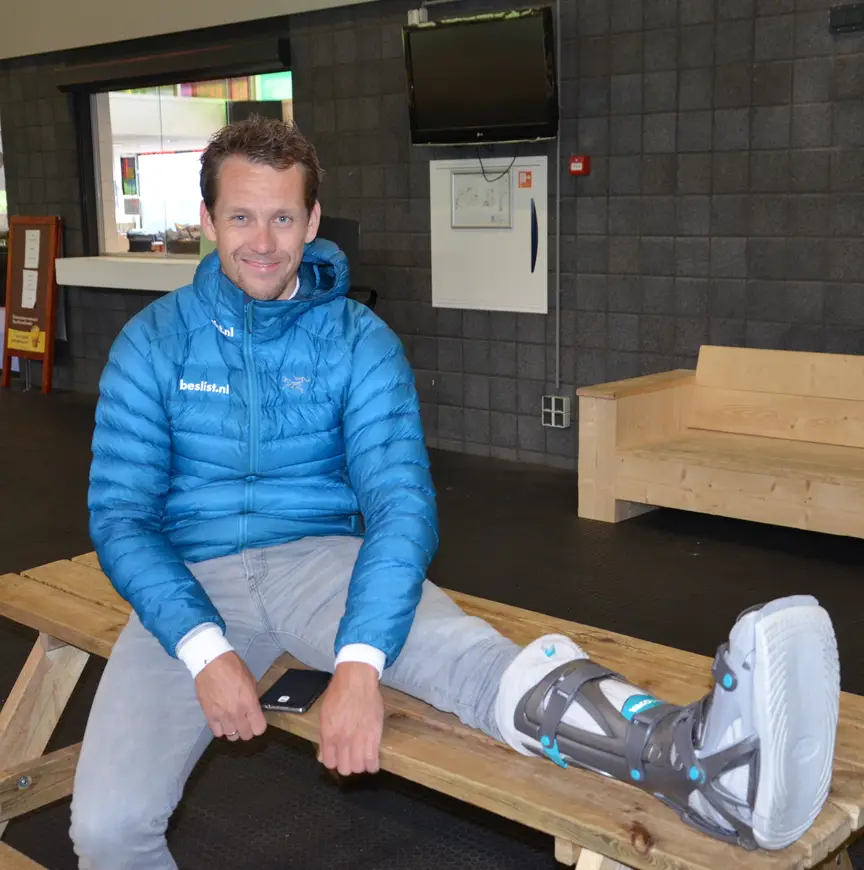 "Het is een soort mobiel gips", zegt hij. "Je kunt het gelukkig afnemen, dat is een groot voordeel." De oorzaak van het gips is een val die Groothuis vier weken geleden op de skeelers maakte. Hij liep daarbij een schouderblessure op, maar ondanks een pijnlijke enkel leek de schade daaraan mee te vallen. Pas ruim een week later bleek dat het ook met de enkel van Groothuis mis was.