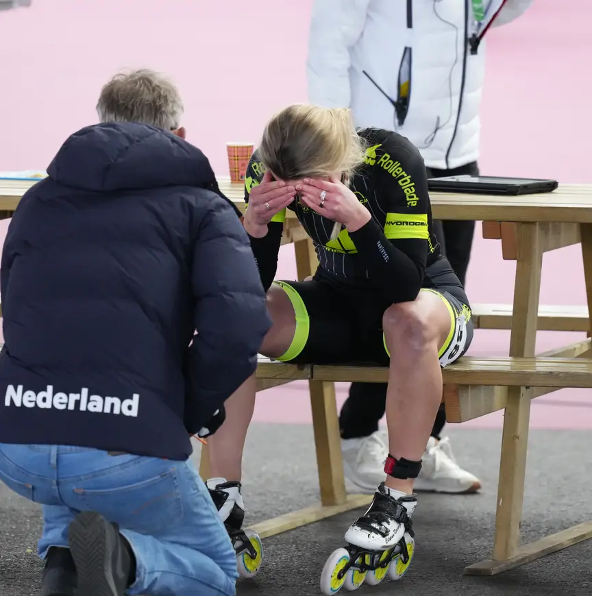 Bij het horen van de bel maakte Berber Vonk een lelijke schuiver in de halve finale van de 500 meter. Haar skeelers kwamen in aanraking met de wieltjes van Marieke de Vries en beide vrouwen gingen naar de grond. De Vries verliet met een geblesseerde pols al snel de baan, Vonk bleef zitten.