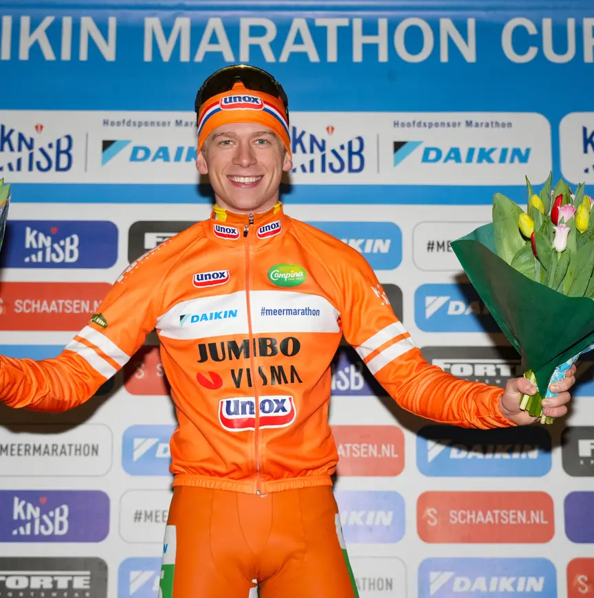 De familie Visser heeft het hele seizoen nog niet zonder bloemen gezeten, de 23-jarige Harm gaat maar door met het binnenslepen van prijzen. Zaterdag pakte hij alweer zijn achtste van het seizoen in het kader van de Daikin Marathon Cup. Op de Weissensee werd hij vakkundig uit de koers gereden door de concurrenten die dit seizoen vaak genoeg het hoofd moesten buigen voor de stratenmakerszoon uit De Westereen. En dan was er nog de ziekte die het team Jumbo-Visma parten speelde. Visser had zelf na het NK in Leeuwarden zijn portie gehad, ploegmaten Mats Stoltenborg en Robert Post waren overwegend ziek. “We hadden veel pech, maar nu kunnen we weer vooruitkijken”, aldus Visser.