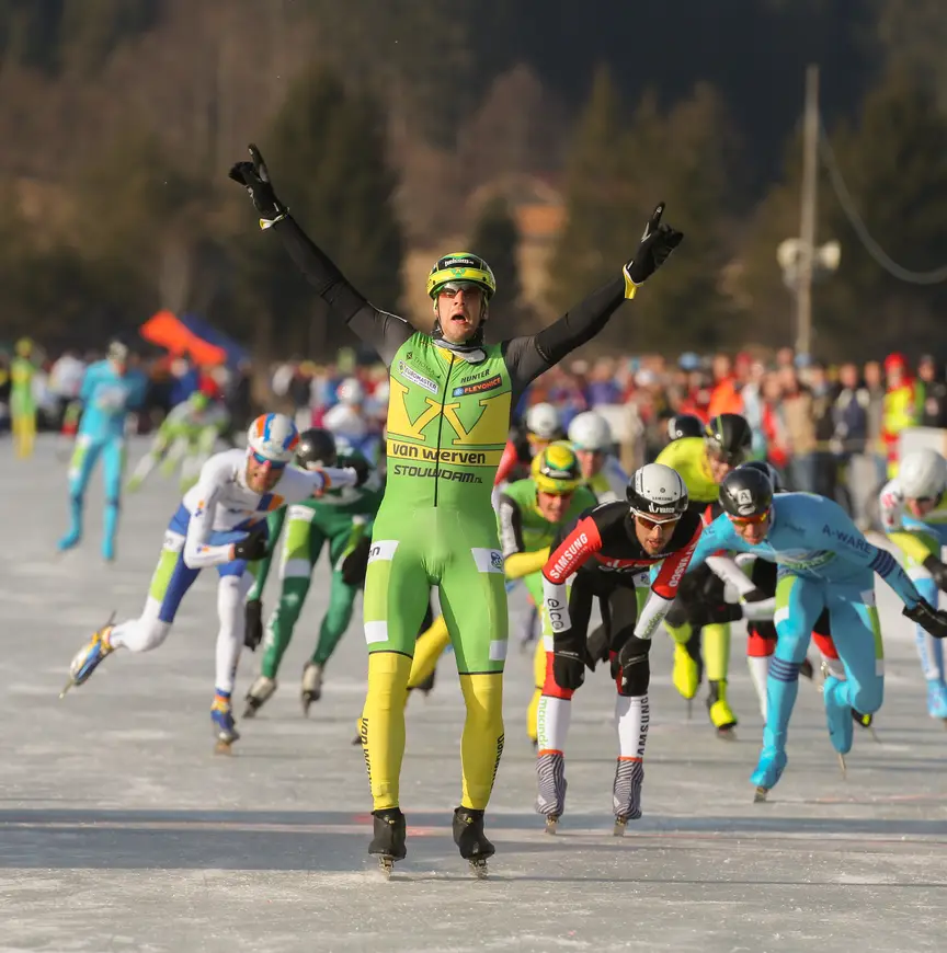 De sprint werd inderdaad een tweestrijd tussen de Italiaan en Hekman, die pas in de laatste vijftig meter Francolini voorbij stak. ’’Ik hield vooral rekening met Evert Hoolwerf, die de hele wedstrijd al achter me zat’’, stelde Hekman. De Tjolk-rijder zat inderdaad achter Hekman, maar wel op een meter of vijfhonderd, met een kapotte schaats. Francolini pakte zo plaats twee, net voor Ariëns, die daarmee het succes voor Van Werven compleet maakte.