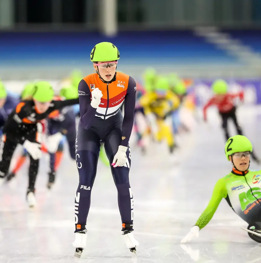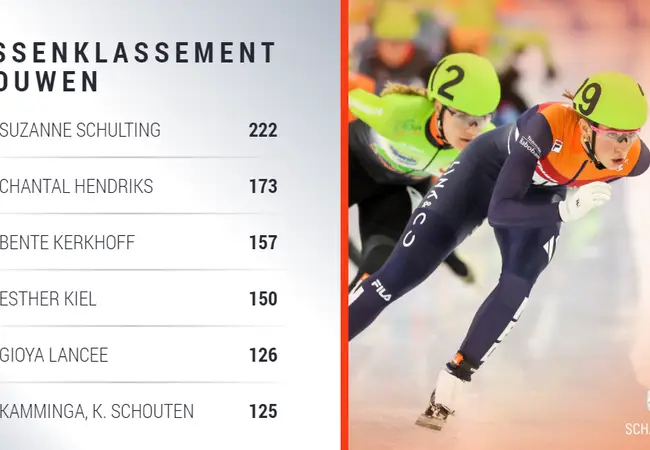 Bij de vrouwen werd de finish ontsierd door een valpartij van Manon Kamminga. Met nog 250 meter te gaan raakten zij en Schulting elkaar, waarna beiden met schade aan de schaatsen verder sprintten. Op het laatste stuk raakte Kamminga in onbalans, waardoor ze tegen de binnenboarding viel. Desalniettemin werd ze nog tweede, voor Bente Kerkhoff. "We tikten elkaar aan, dus ik ging niet heel lekker meer door de laatste bocht", vertelde Kamminga. Waar ze eerder Schulting passeerde, kon de shorttrackster haar nog voorbijsteken op het laatste stuk.