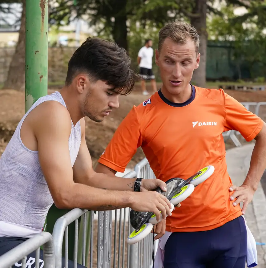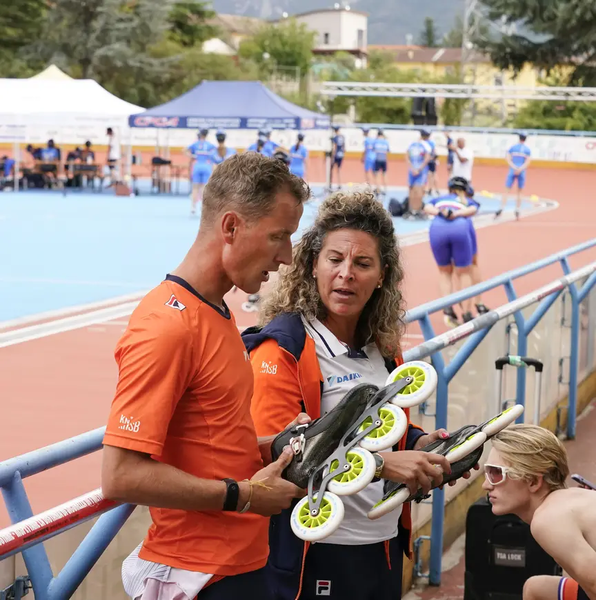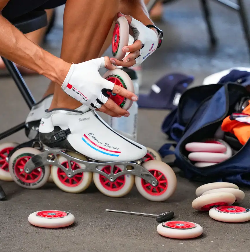 “Je ziet een topper rijden met wielen die je niet bekend voorkomen en dan begint het denken. Wat voor wielen zijn dat? Die moet ik ook hebben.” In dit geval betreft het een set met een kern van fluorescerend groen, vervaardigd door de Amerikaanse fabrikant Powerslide. In L’Aquila deelde Pascal Briand, speed manager van het merk, afgelopen vrijdag de wielen uit aan geïnteresseerden. Althans, aan degenen die er op tijd bij waren én 240 euro over hadden voor acht van die rollende bandjes. Dijkstra behoorde tot de gelukkigen. Hij legt uit dat het om connecties draait. “Het is steeds een verrassing hoeveel sets er beschikbaar zijn, dus je moet er vroeg bij zijn.”