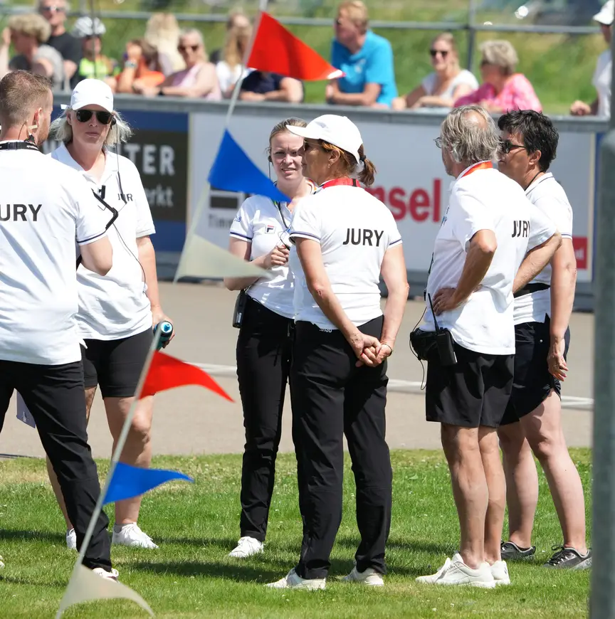 Het is kortstondig geluk. De jury dromt samen op het middenterrein. Zeven, acht mannen en vrouwen buigen zich met elkaar over de vraag wat ze allemaal hebben waargenomen. ’n Lastige klus, dat is duidelijk, maar er komt een verdict. “Rémon Kwant wordt gediskwalificeerd”, roept de speaker. “En de andere drie rijders zullen opnieuw starten.” Het zijn mededelingen met hetzelfde effect als olie op een vuur. De discussies laaien op, en hier en daar raken sommige mensen al vlug tamelijk oververhit.
