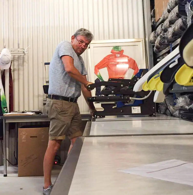 Maar evengoed moesten al die logo’s nog wel worden gedrukt. En daar heeft Dillen zijn eigen systeem voor ontwikkeld, met verschillende toetsingsmomenten zodat er niets fout gaat. Waar hij in het hele proces veel schakelt met de afdeling Topsport van de schaatsbond (“We werken fantastisch samen, zonder hen kan ik dit werk echt niet doen”), is hij wat betreft het drukken van de logo’s liever alleen. De aanwezigheid van anderen zou zijn manier van werken in de war kunnen schoppen. Nee, Dillen sluit zich lekker op in zijn loods, kijkt niet op de klok en werkt door tot het echt niet meer kan.