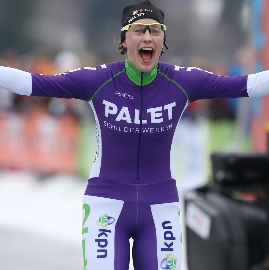 De kopgroep bestond uit acht meiden. Mijn ploeggenotes reden in het peloton achter ons. Uiteindelijk kwam het op een sprint aan. Ik had nog vrij veel over voor mijn gevoel, waardoor er een klein gaatje ontstond met de rest. De voorsprong hield ik vast en kwam als eerste over de finish. Ik was compleet verbaasd en mocht na deze race ook nog in het leiderspak rijden. Het bizarre is dat mensen achteraf zeiden dat ze het aan hadden zien komen: ‘Je reed zo goed.’