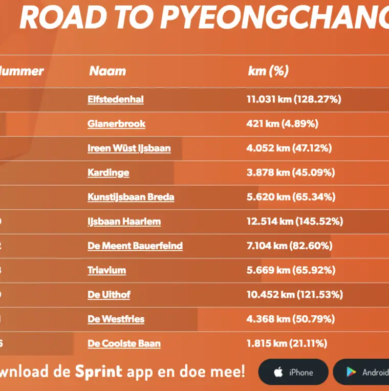 Er zijn drie ijsbanen die PyeongChang behaald hebben in de olympische maand, maar we blijven de ijsbanen stimuleren om dit schaatsseizoen nog de 9000 kilometer te halen. De Elfstedenhal in Leeuwarden, IJsbaan Haarlem en De Uithof in Den Haag, gefeliciteerd met deze prestatie. Schaatsen jullie in maart ook weer terug naar Nederland?