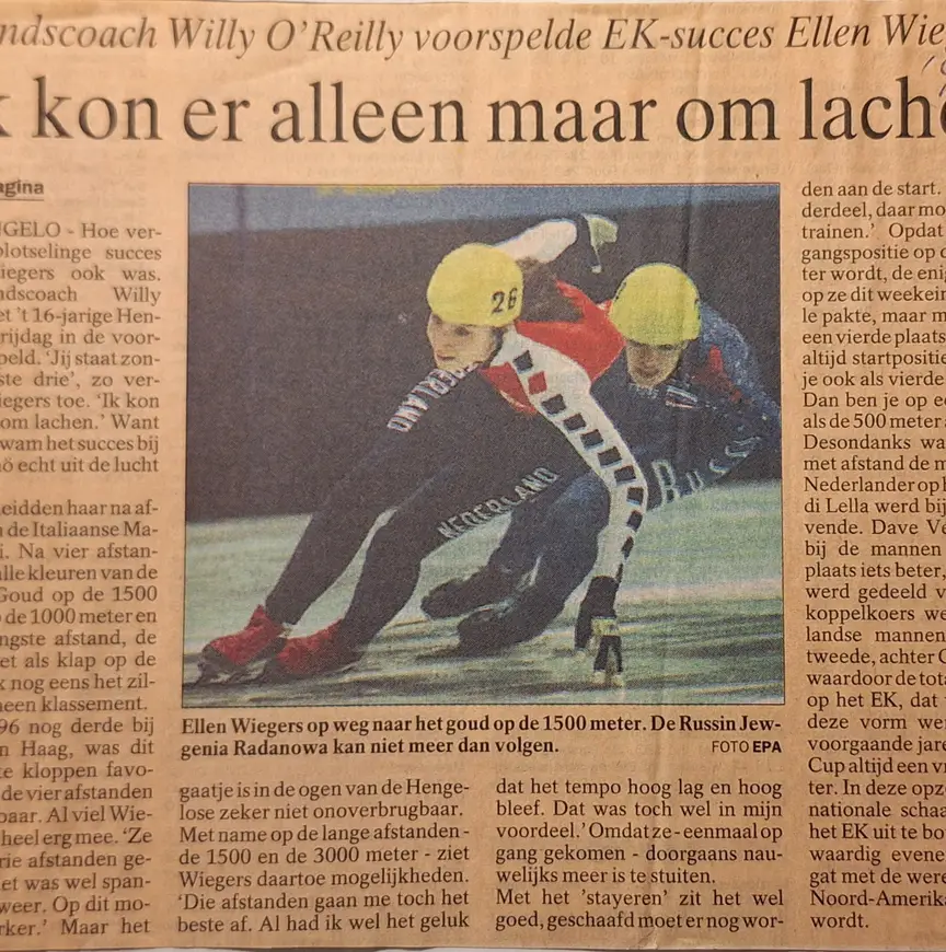 Geen verkeerd besluit. Vrijwel direct draaide ze mee met de beste shorttrackers van Nederland. In ’97 dus al present op het EK, in het gezelschap van Penelope Di Lella, Esmeralda Bos en Anke Jannie Landman. ‘Coach Willy O’Reilly voorspelde EK-succes Ellen Wiegers’ kopte de Twente krant Tubantia. En: ‘Ik kon er alleen maar om lachen’. Aldus Wiegers in een reactie op de bewering van de huidige disciplinemanager Shorttrack bij de KNSB, die had aangegeven dat ze in het eindklassement tot de top-3 zou behoren.