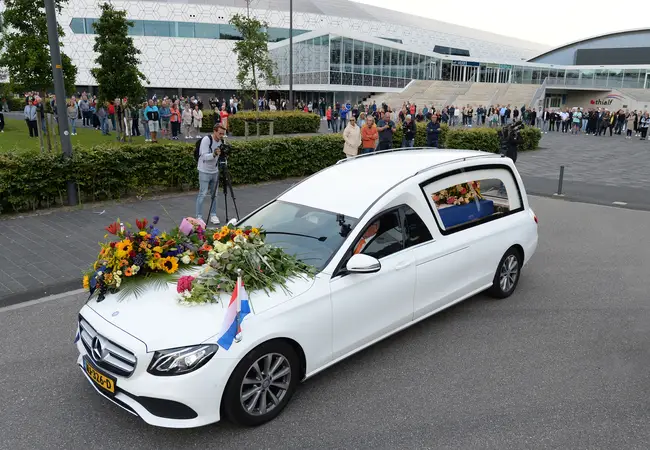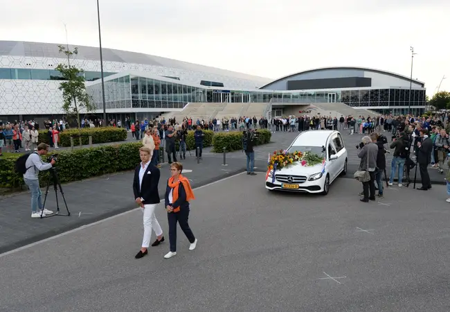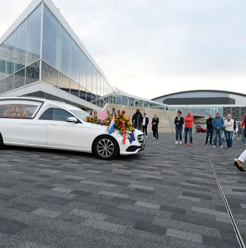 Het is stil op het terrein rondom Thialf, waar normaal gesproken de sporters hun auto of fiets stallen en gaan trainen in het stadion. Terwijl de zon woensdagavond door de wolken breekt, rijdt een witte rouwauto met voorop een bloemstuk stapvoets naar de ingang van de dweilmachines. Op de kist met Nederlandse vlag liggen de schaatsbril en schaatsen met de kenmerkende panterprint. Bij de schuifdeur staat Van Ruijvens vriend Ivar haar op te wachten, vechtend tegen de tranen. In het stadion rijdt de auto een laatste rondje omringd door de familie, shorttrackers en begeleidingsstaf. Ze dragen allemaal een wit shirt met een panterhartje op de borst en #PanterLara op de rug.