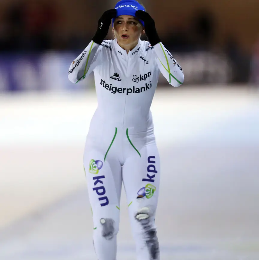 Op de bel schoof de Noord-Hollandse aan de binnenkant van de baan onderuit, stuiterde op het asfalt naast het ijs en zag op haar knieën de rest van het peloton voorbijschieten. Zichtbaar balend kwam ze uiteindelijk over de streep.
