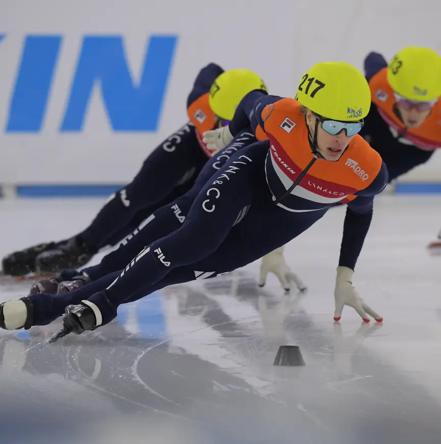 De snelste op alle tijdritten die vrijdag zijn gereden. En nu, na de korte ochtendsessie van deze zaterdag, prijkt zijn naam ook bovenaan in de ranking van de 1000 meter. 1. Jens van ’t Wout, 2. Sjinkie Knegt, 3. Kay Huisman. Dat betekent 34 kostbare punten in de strijd om de wereldbekertickets, het eerste belangrijke hoofdstuk deze winter voor de nationale shorttracktop. Hij had er al 10,2, de beloning voor elke gewonnen rit tegen de klok. “Als het me lukt om op de 500 en 1500 meter van zondag in de top-2 te komen, ben ik er”, meldt de jongste (nog net twintig jaar) rijder van de Nationale Trainingsselectie met een grote glimlach op het gezicht. “Het gaat lekker, ja, ik kan niet anders zeggen…”