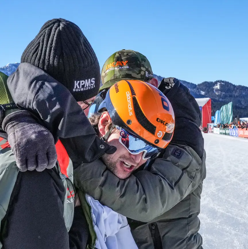 Ze zochten in de kopgroep van negen voortdurend naar berijdbaar ijs, wat er niet meer was. “In de schaduw leek het nog wat, maar zodra je daarheen stuurde, werd het ploeteren door sneeuwbergen. Tijdens de slotronde begon ik mijn plan te maken voor de laatste keer dat we de verzorgingsstraat zouden ingaan. Wat er ook zou gebeuren, ik moest op kop zitten, aangezien het onmogelijk was daar nog anderen te passeren. Tegelijkertijd moest ik rekening houden met de andere slag van schaatsen die zo aangepast moest zijn dat ik nog snelheid zou kunnen maken. Het draaide om techniek en volgens mij ben ik de gehele race aardig over dit ijs gegaan. Dat leverde me de energie op die ik nodig had voor de slotkilometer. Nou, dit is het resultaat.” Hij hief de armen nog eens in de lucht. “Man, wat ben ik gelukkig.”