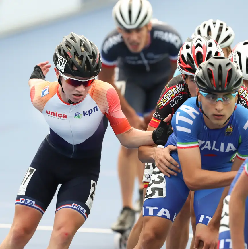 Den Heijer bekijkt de schaafwond die de schuiver over het vesmaco op zijn elleboog heeft achtergelaten. "Dat gaat nog wel pijn doen. Een van de Italianen viel en hij is nogal breed, dus ik ging er meteen overheen." Ondanks de harde klap dacht Den Heijer er geen moment aan om niet door te rijden. "Tijdens de Europa Cup viel ik hier ook en toen reed ik net niet vol door. Nu dacht ik; Ik sprint er vol naar toe. Maar toen was het klaar, ik voelde zoveel verzuring in mijn benen. Ik zat eigenlijk helemaal fris, totdat ik viel."