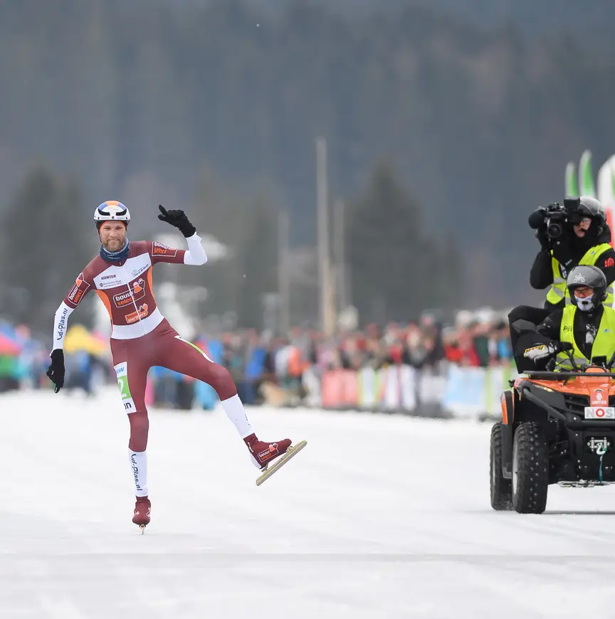 Na ongeveer een uur schaatsen begon de sneeuw te vallen boven het ijs van de Weissensee. De mannen reden dapper door en bleven de aanvallen opvolgen. Het maakte de wedstrijd hard, ook voor Hoogeveen. "Ik zag dat er veel vermoeidheid was in het peloton. Ook zelf was ik moe, ik viel ook een paar keer. Maar ik ben gewoon blijven gaan, dan lukt het wel."