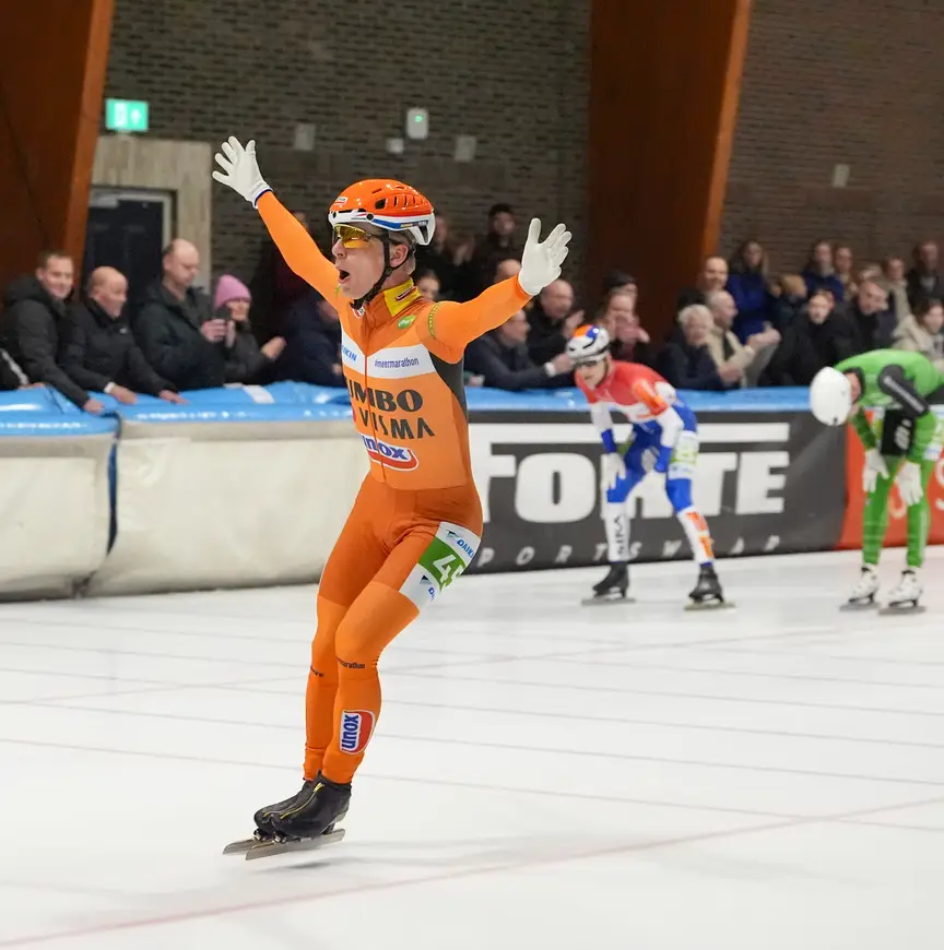 “We hebben hier helaas een dikke prijs laten liggen”, gaat De Vries verder, terwijl hij naar de ijsbaan van de Elfstedenhal wijst. Hij doelt op 1 januari, het NK Marathon. In een chaotische eindfase ging Visser onderuit. “Dat is nog een wondje en daar praat ik niet over met de jongens, maar dat gevoel zat er bij mij in. Terug in Leeuwarden, 1 januari lukte het niet en nu wel.” Een ander wondje was de recente natuurijsreeks in Zweden waar Jumbo-Visma een modderfiguur sloeg. “Een mindere week”, noemt De Vries het. “Drie wedstrijden zoals het niet moet. Kan gebeuren, je probeert te zoeken naar een oorzaak en die hebben we nog niet kunnen vinden.”