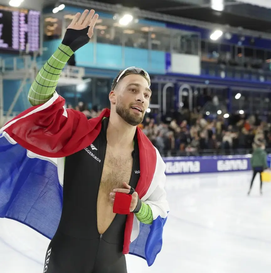 “Fantastisch”, tetterde hij voort. Nee, inderdaad, niet zo’n geel weekend”, counterde hij een opmerking van zijn toehoorders die de belabberde optredens van Jumbo-Visma graag ter sprake brachten. “Nou, dat was het WCKT evenmin; daar pakten ze een plekje. Waar het aan ligt, moet je niet aan mij vragen. Ik ga alleen van mezelf uit. Ik heb geen idee wat ze bij Jumbo aan het doen zijn. Ik hoop dat zij het wel weten. Wat wij uitstekend doen is schaatsen op onze techniek, waardoor iedereen per week vooruitgaat. Gerard van Velde, onze coach, roept weleens wanneer we in een treintje over het ijs glijden dat de anderen voor zich moeten kijken, naar mij, omdat ik het zo goed doe. Dat is fijn om te horen hoor.