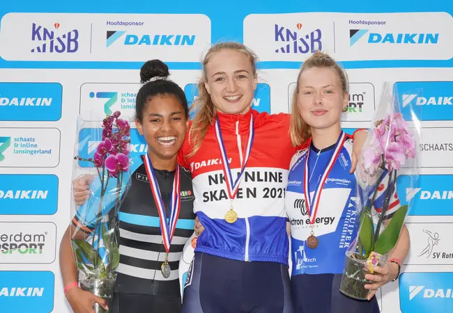 Het NK over 100 meter vond dit seizoen voor de vierde keer in de geschiedenis plaats. In 2016 werd dit korte sprintnummer voor het eerst aan het Nederlands kampioenschap inlineskaten toegevoegd, maar door allerlei omstandigheden gingen de vorige twee edities niet door. Klijnstra won de eerste drie edities en schreef ook de editie van 2021 op haar naam. Ze hield jongeling Lataesha Narain met een verschil van 0,3 seconden achter zich. Narain mocht zich door haar prestatie wel de Nederlands kampioene bij de A-junioren noemen.