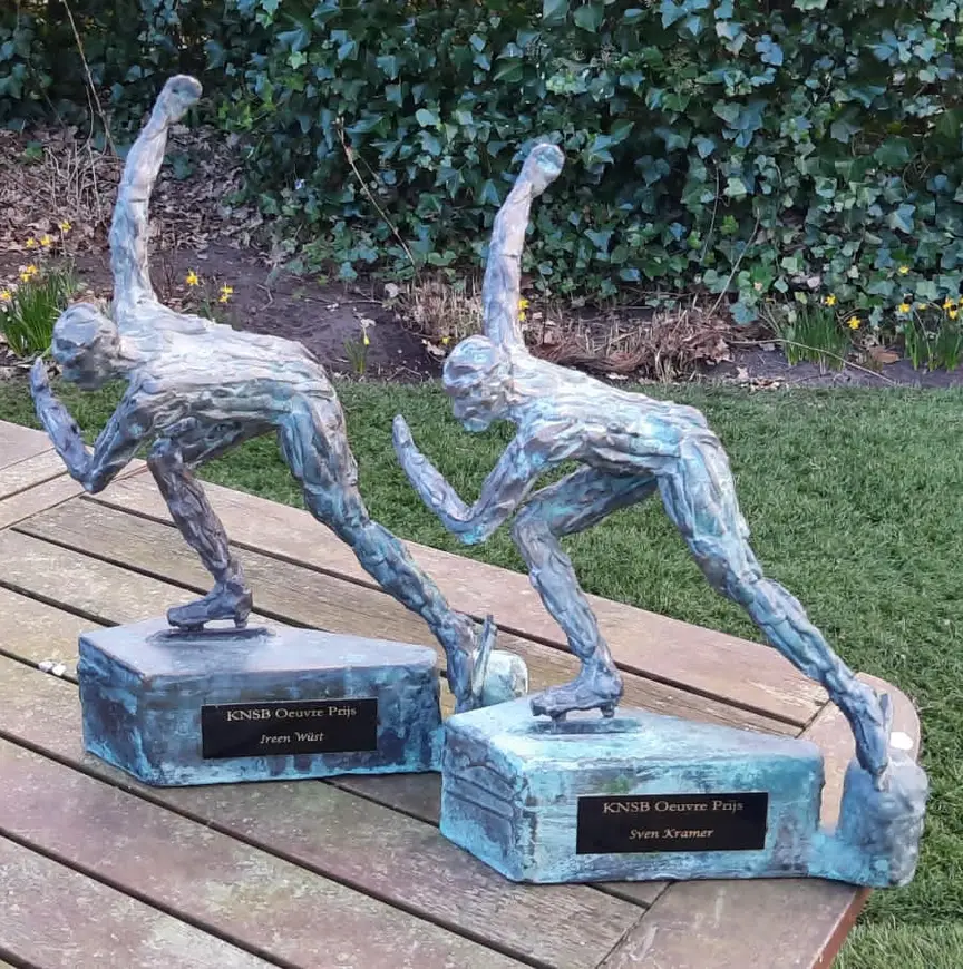 Een week of drie terug kwam de vraag. Of beter, het was een opdracht die hij als gepassioneerd beeldend kunstenaar onmogelijk kon negeren. De 62-jarige Puttenaar is zelf een fervent fietser, schaatste drie Elfstedentochten en is de jongste jaren steevast op de Weissensee te vinden. “Dus wat gebeurt er wanneer je wordt gevraagd of je voor twee iconen van het Nederlandse schaatsen iets moois kunt maken? Dat is de kroon op je werk! Dan ga je aan de slag, ongeacht het feit dat je weet dat je eigenlijk niet in zo’n kort tijdbestek een beeld kan af hebben. Wat zeg ik? Twee hè: voor Sven en voor Ireen een. Ik kwam ermee bij mijn vaste bronsgieter die onmiddellijk zei dat ik iets wilde wat niet haalbaar was. Toch heeft hij geholpen, omdat hij begreep dat dit iets speciaals was.”