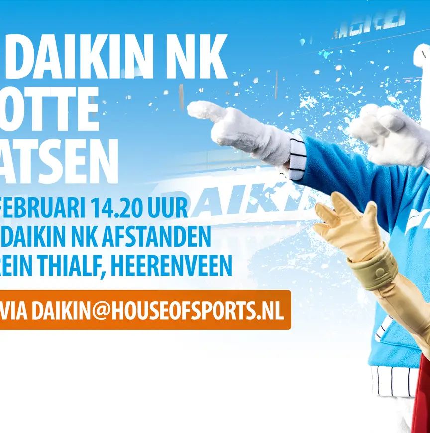 Op 3, 4 en 5 februari strijdt de Nederlandse schaatstop tegen elkaar op de Daikin NK Afstanden in Thialf. Naast de verschillende afstanden wordt er op zaterdag 4 februari nog één extra afstand verreden: het Open Daikin NK Mascotteschaatsen. Denk jij dat jij kans maakt en vind jij het leuk om mee te doen aan dit Nederlandse Kampioenschap? Dan is Daikin opzoek naar jou! De hoofdsponsor van de KNSB nodigt je uit op zaterdag 4 februari 2023 van ongeveer 11.00 uur tot 15.00 uur om mee te doen. Om ervoor te zorgen dat jij wordt aangemoedigd vraagt de organisatie iedere deelnemer een eigen begeleider mee te nemen en mag je tien mensen uitnodigen om te komen kijken. Na de finale zorgt Daikin ervoor dat je ook kan plaatsnemen op de tribune om de Nederlandse schaatstop aan te moedigen.