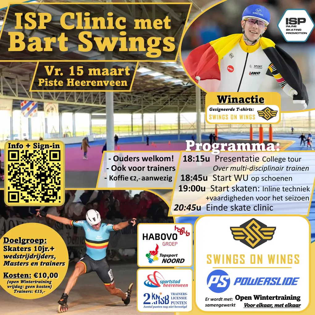 Net klaar met het schaatsseizoen staat de Belgische alleskunner Bart Swings alweer in de startblokken om zijn skeelerkunsten te vertonen. Dat gebeurt komende vrijdag 15 maart al op de inlineskatepiste in Heerenveen, vlakbij het Abe Lenstra-voetbalstadion. Swings geeft dan een clinic voor skaters van tien jaar en ouder, wedstrijdrijders, masters en trainers. De nadruk ligt op inline-techniek en vaardigheden. De sessie van 19.00 tot 20.45 uur wordt voorafgegaan door een zogenoemde collegetour waarin hij zijn 'geheimen' deelt van multidisciplinair trainen. Swings gunt dan vanaf 18.15 uur indirect een inkijkje in zijn drukbezette bestaan als langebaanschaatser, meervoudig wereldkampioen en olympisch kampioen op mass start, marathonrijder en fervent en zeer succesvol skeeleraar. Kosten voor deelname zijn € 10,- per persoon. Trainers betalen € 15,-