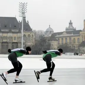 Eén ding is zeker: de plaatjes vanaf de stadsvijver midden in Boedapest zullen komend weekend door de feeërieke achtergrond mooi zijn, zoals ook onderstaande foto van oud-ploeggenoten Ireen Wüst (op kop) en Renate Groenewold bewijst.