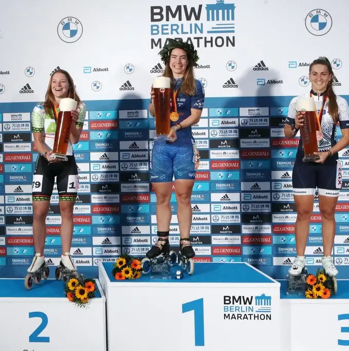 Dat vertelt ze eerder deze week vanuit Berlijn, waar ze afgelopen weekend nipt het gevecht om de zege in de prestigieuze skatemarathon verloor van de Francaise Marie Dupuy, de vrouw die ze in L’Aquila nog op sensationele wijze aftroefde. Heel even voelde ze de pijn van die nederlaag en baalde. Op hetzelfde moment hoorde ze echter de stemmen van haar coach bij A6.nl, Manon Hekman-Kamminga, en enkele ploeggenotes op de achtergrond: ‘Dit is wel Berlijn hè, de grootste inlineskatehappening ter wereld waar jij als nummer twee op het podium staat. Je mag best blij zijn’, tetterden die meiden in haar oren.