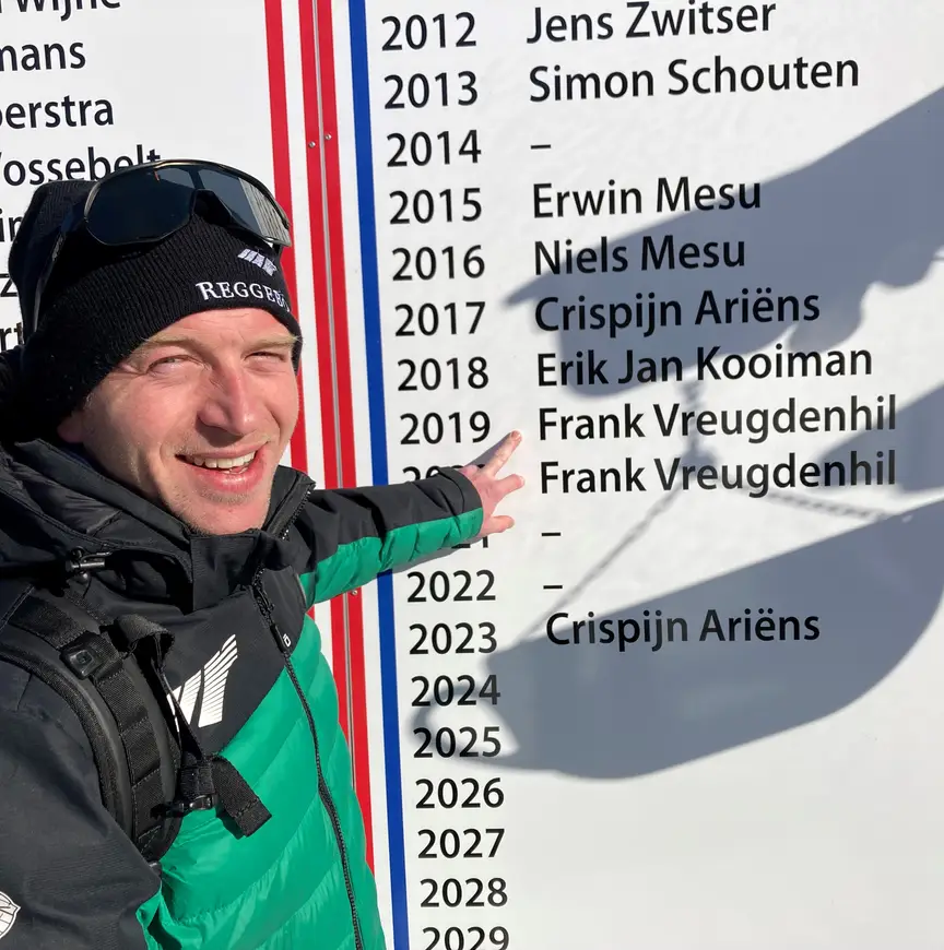 Een dag voor de start van de Alternatieve lopen we een oud winnaar tegen het lijf: Nee, natuurlijk vindt tweevoudig kampioen Frank Vreugdenhil het geen probleem even te poseren bij het bord aan de Weissensee waarop alle winnaars en winnaressen van de AET staan vermeld. Hij memoreert aan het jaar voordat hij aan de ‘dubbel’ begon, toen Erik-Jan Kooiman zegevierde. “Vanaf dat moment zijn we met AB Vakwerk als team gaan rijden, met het doel voor een van tevoren aangewezen man. Dat maakte het eenvoudiger jezelf op te offeren voor een ander. Eerder was het ieder voor zich en dan zorgen dat je de finale haalde. De kracht van Reggeborgh is het samen te doen, om de risicofactor kleiner te maken. Anders is het net een lot uit de loterij.” Kortom, Reggeborgh verwacht vandaag alles van Crispijn Ariëns, de nummer 1 van 2023.