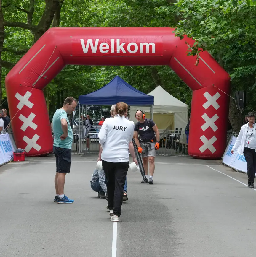 13.20: De laatste hand wordt gelegd aan het unieke 100 meter parcours van de Daikin NK Inlineskaten in het Vondelpark.