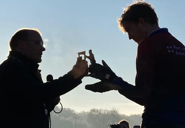 Na de finish ontvangt Bart Vreugdenhil van burgemeester Joris Bengevoord een beeldje.