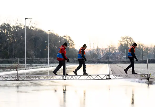 In Winterswijk is de hele nacht doorgewerkt om de recordpoging mogelijk te maken. Met enthousiaste vrijwilligers en hun technische kennis is de ijsvloer 1,5 centimeter dik geworden.