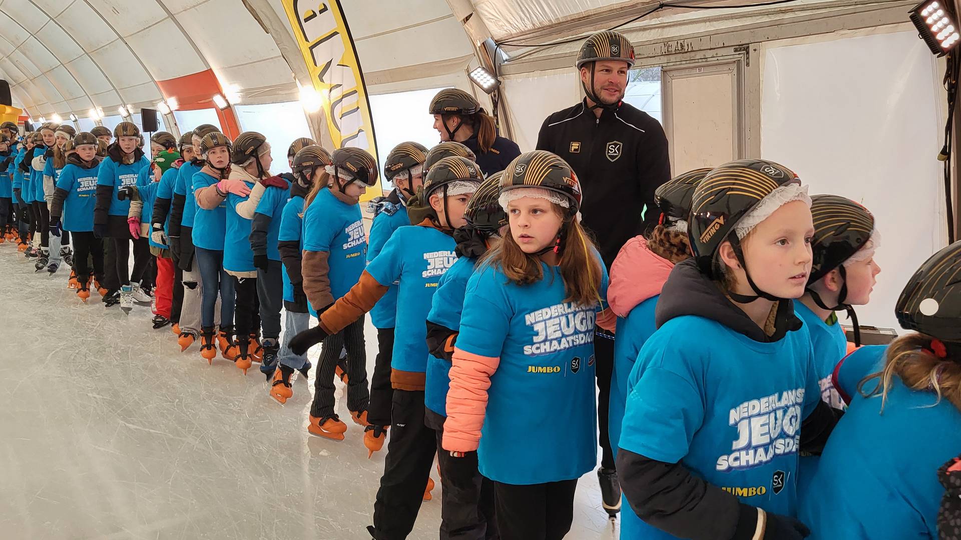 Het was een drukte en gekakel van belang op de unieke tunnelbaan van Rotterdam. Zo’n 300 kinderen van een drietal basisscholen maakten een lange sliert voor een heuse wereldrecordpoging polonaise schaatsen. Dat was al een prestatie op zich voor de begeleiders van de Sven Kramer Academy.