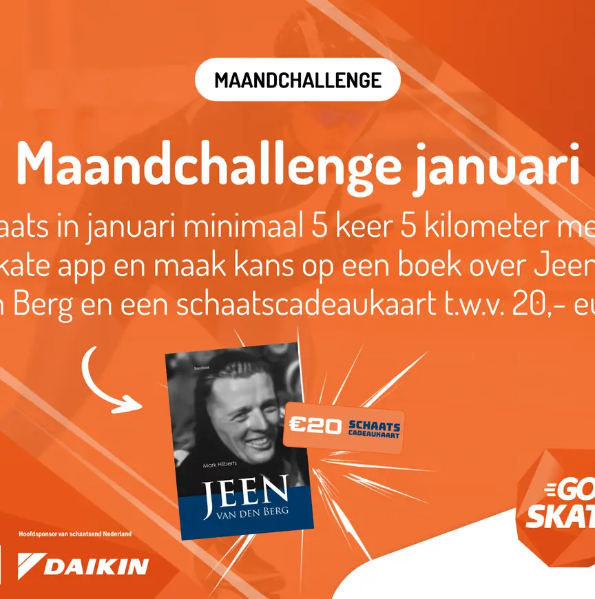 Schaats in januari minimaal vijf keer 5 kilometer met de GoSkate app en maak kans op een boek over Jeen van den Berg en een schaatscadeaukaart t.w.v. 20,- euro!
