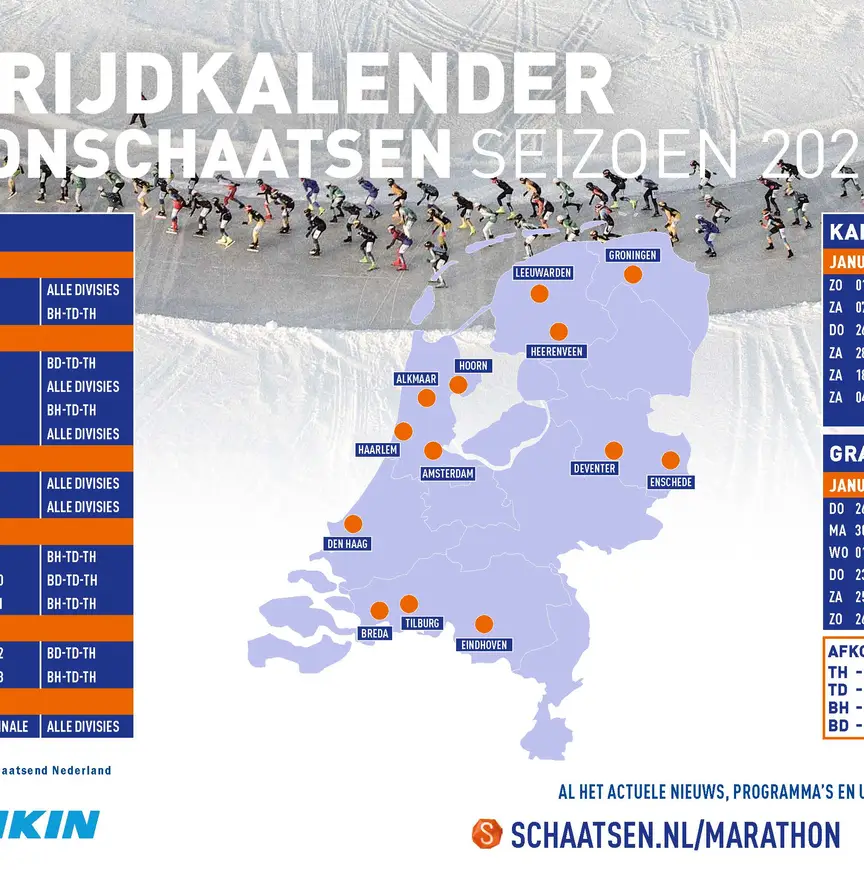 Opmerkelijke zaken op de kalender met veertien of vijftien races om de Marathon Cup, vijf Grands Prix op natuurijs en uiteraard de NK’s op kunstijs: in december staan er vooralsnog twee marathons gepland. “Dat is wat weinig”, vindt Hut. Er ligt een plan om in het weekend van 10 en 11 december twee dagen achter elkaar een wedstrijd te programmeren. “Dat hangt ook een beetje af van de ontwikkelingen rondom een vierdaagse. Na het stoppen van Trachitol als hoofdsponsor is het nog niet gelukt een nieuwe partner te vinden. Toch houd ik hoop dat die er alsnog komt, net zoals een naamgever voor de Marathon Cup. In dat geval wordt de vierdaagse tussen 15 en 18 december verreden."