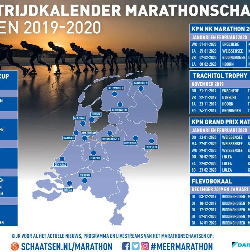 Het seizoen start op 19 oktober traditiegetrouw in Amsterdam met de 48e Jaap Eden Trofee en eindigt eind februari. Op de Jaap Edenbaan wordt ook de eerste wedstrijd gereden in de beloftendivisie voor vrouwen. Deze nieuwe landelijke marathoncategorie behelst acht competitiewedstrijden en drie doorstroomwedstrijden, zoals we die ook kennen bij de mannen. Net als vorig jaar is de finale van de KPN Marathon Cup in Leeuwarden. "We willen het seizoen met een knaller afsluiten en Leeuwarden heeft vorig jaar laten zien dat ze daartoe in staat zijn", vertelt marathoncompetitieleider Willem Hut.