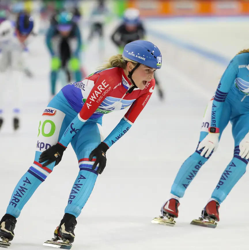 "Ik zat er tijdens de wedstrijd wel een paar keer doorheen, maar daarna zocht ik de goede persoon op om te herstellen en ging het weer lekker. In de laatste paar rondjes zat ik achter Irene (Schouten, red.) en dat ging perfect. Zij waaierde heel erg de laatste bocht uit, waardoor ik óf moest remmen óf binnendoor moest gaan. Ik dacht: als ik rem, ben ik mijn goede klassering kwijt. Dus ben ik binnendoor gegaan en dat pakte goed uit."