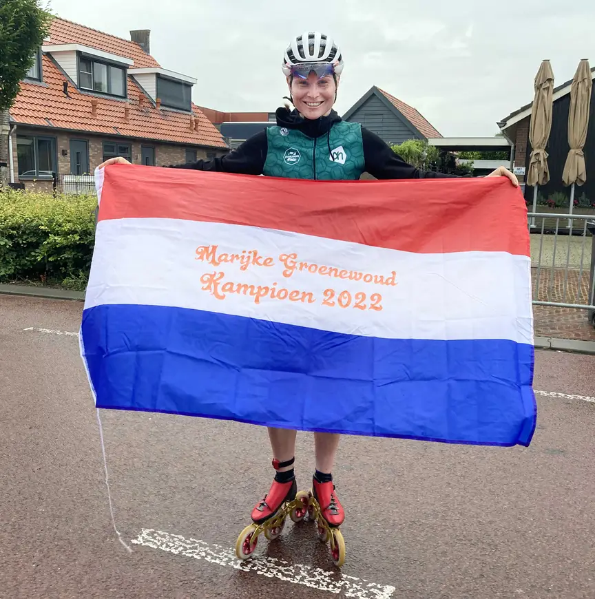 Groenewouds glunderende bekkie sprak boekdelen. Amper over de streep gekomen had ze al staan zwaaien met de vlag, die ze kreeg aangereikt door een vrouw in sportkleren met beennummer 279. “Dat was Leonie Pol. Haar droom was een NK te rijden. Zover was et vandaag en ze was er ontzettend blij mee. Ze is een fan van me, heeft ze me verteld, en via Facebook stuurt ze me regelmatig berichtjes. Vorige week na een wedstrijd gaf ik haar iets, en nu ontving ik een cadeautje terug. Heel leuk. Deze vlag komt mooi naast mijn prijzenkast op mijn kamer te hangen. Echt gaaf om te krijgen, zeker wanneer je zoiets niet verwacht.”