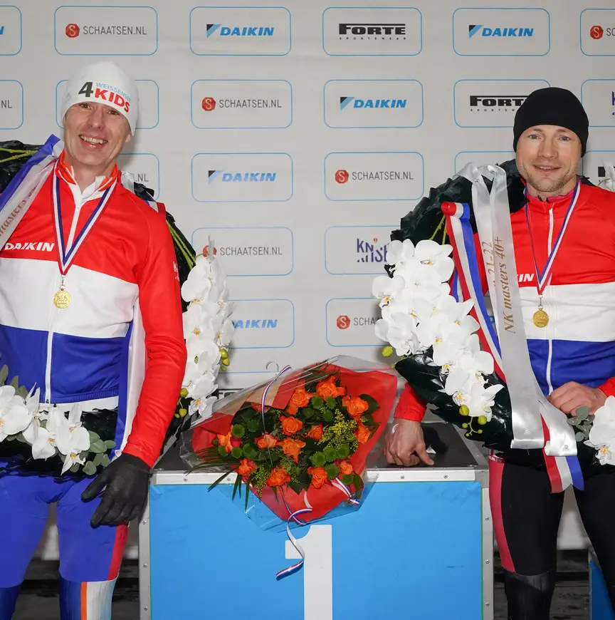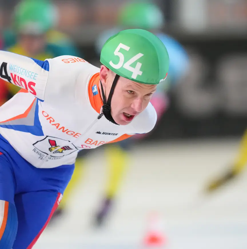Ook niet als een gevecht om de rood-wit-blauwe trui een wat merkwaardige apotheose krijgt in een wedstrijd waar de twee leeftijdsklassen door elkaar heen schaatsen. Dat Van de Nes, een 53-jarige Zwollenaar die in 2010 en 2019 ook al de beste van Nederland werd tussen de mannen-op-leeftijd, met de zege aan de haal zou gaan, stond halverwege de race al vast. Als een nooit stilvallende locomotief trok hij in het eerste gedeelte van de koers het peloton op een lint, op die manier veel ‘dood en verderf’ zaaiend: binnen de kortste keren gleden groepjes geloste rijders verspreid over het ijs van de Optisport kunstijsbaan in Breda.