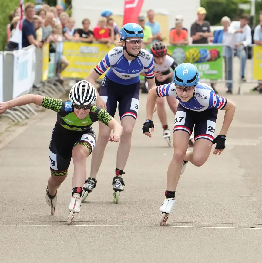Voor de rijdster van KNSB Talent Team Noord was het tot de wedstrijddag spannend of ze kon rijden. “Ik heb elke dag een half uurtje gefietst en tien minuten proberen te skeeleren. Op de dag na mijn val haakte ik al na vijf minuten af vanwege de pijn. Eigenlijk wist ik vandaag pas bij het inrijden dat ik kon starten.”