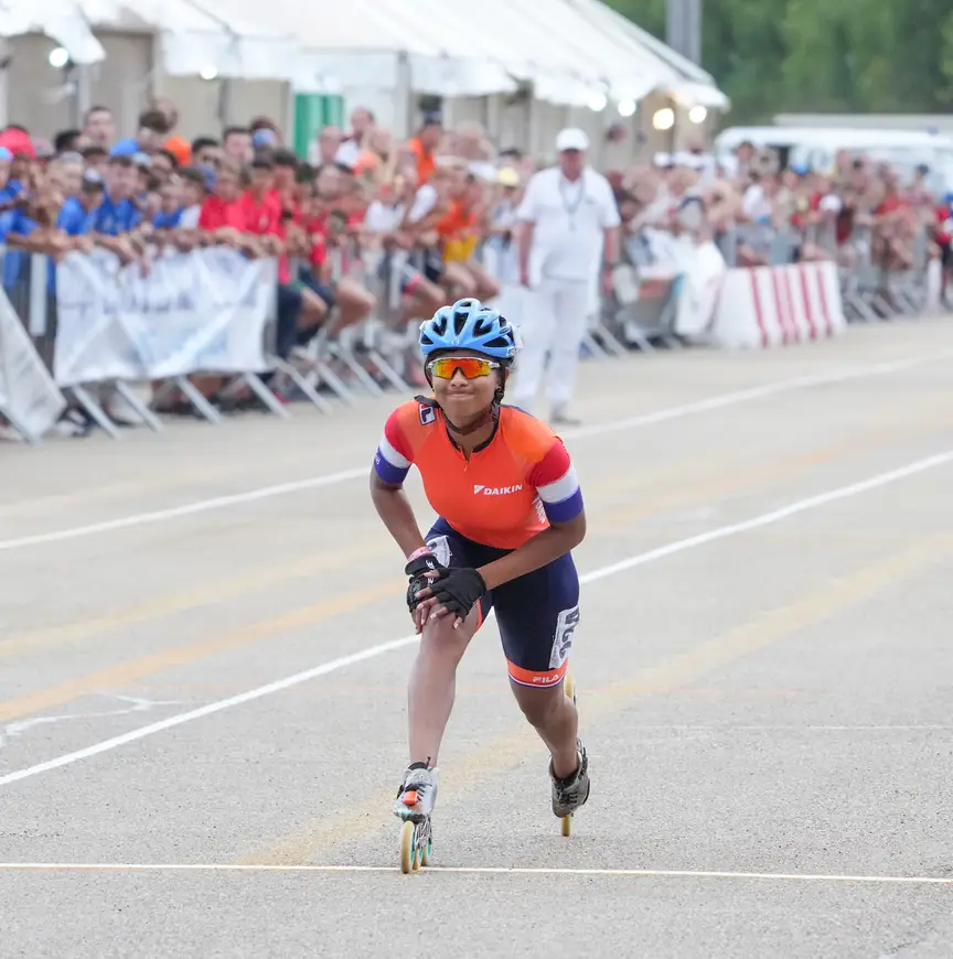 “Ik gooide mijn diepste spagaat, maar het was niet genoeg. Dan baal je. Ook omdat ik met mijn tijd in de eerste halve finale wèl gewonnen zou hebben.” Toch mag ze niet ontevreden zijn met een vierde plaats op haar WK-debuut. “Ik had niet verwacht dat ik dit zou kunnen rijden. Mijn schoenen zijn de sleutel geweest, daardoor kon ik goed versnellen.”