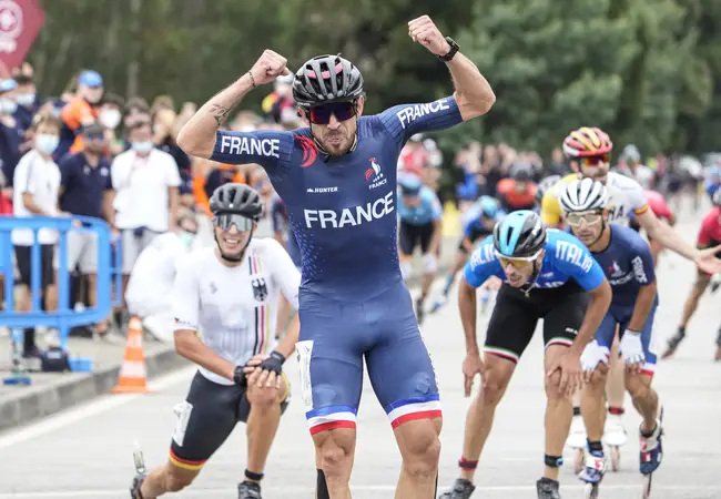 Bij de heren stond er geen maat op Beddiaf. De regerend wereldkampioen van Barcelona 2019 hield de Italiaan Daniele di Stefano en uittredend kampioen Felix Rijhnen uit Duitsland in de sprint achter zich. Jordy Harink en Luc ter Haar ondernamen nog een dappere duo-attaque in de slotfase, maar kregen van de sterke blokken uit Italië, Frankrijk en Spanje geen ruimte. De Fransen speelden hun overtalsituatie uitstekend uit door of zelf in de aanval te gaan of alle vluchten terug te pakken. Ze zetten een sprinttrein waar geen maat op stond. Beddiaf werd in een zetel afgeleverd voor de sprint, die hij vervolgens met ruime afstand won.