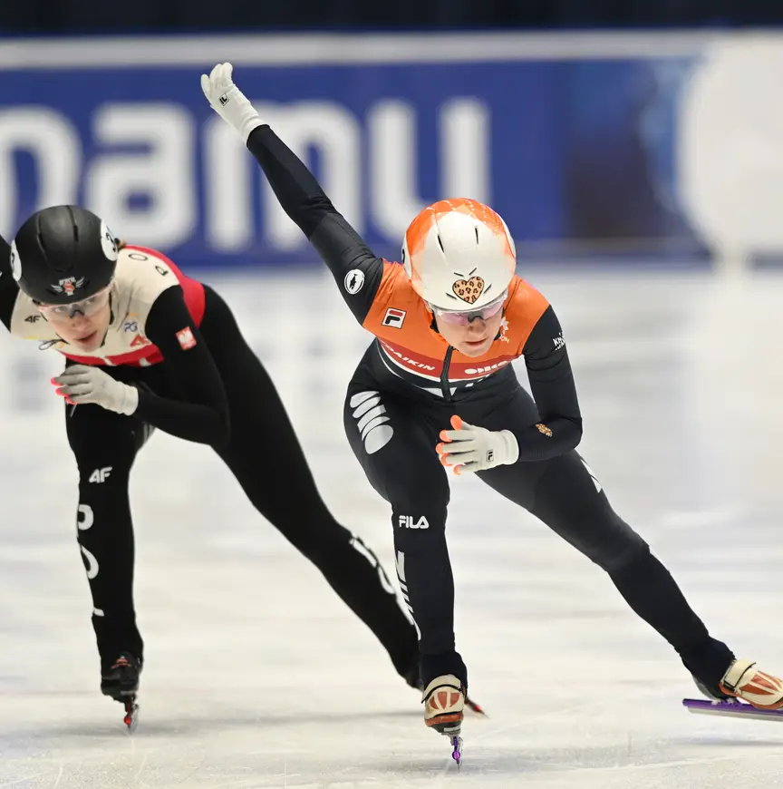 Itzak de Laat werd in zijn 500meter-race door een Koreaan de baan uitgedrukt. In het ‘spierballengevecht’ aan de binnenkant van het ovaal zag de scheidsrechter naderhand bij het video-onderzoek geen overtreding; in de race was de Fries zo ver achteropgeraakt dat hij op slag kansloos was en zondagmorgen een nieuwe poging mag doen de hoofdfase te halen. Dat geldt ook voor Diede van Oorschot (1000 meter) en Bram Steenaart (foto boven), dit seizoen voor het eerst aanwezig in de World Cup (1000 meter).