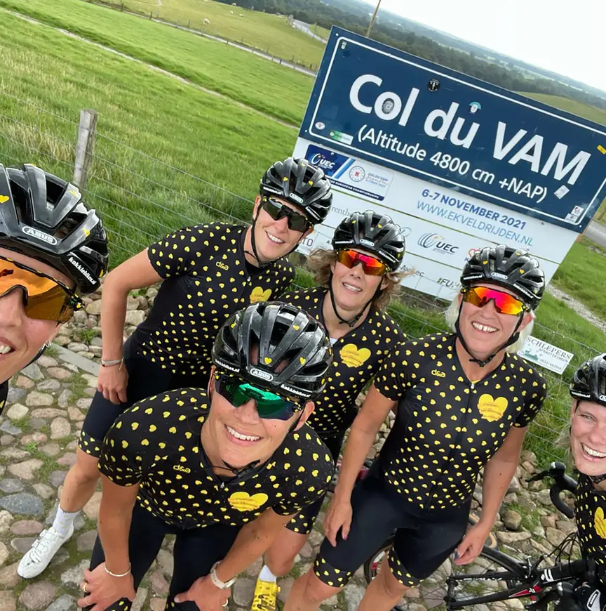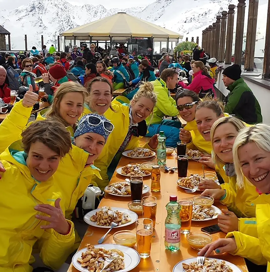 Hard lachend biecht Wieteke op wat absoluut niet mag ontbreken in een ode aan Wüst. “Ze is de beste skiër van team Nuyt!” Andrea licht toe dat dit team ontstaan is tijdens de wintersport, onder het genot van wat drankjes en gezelligheid. “We gingen op skivakantie als groep schaatssters, die elkaar kenden uit de kleedkamer. Het was in een periode dat een aantal geen ploeg meer hadden en ik was de enige die net gestopt was. Toen ontstond het idee: ‘Dan beginnen we een eigen team, word ik jullie coach en noemen we het Team Nuyt.’ De schaatsploeg is er nooit gekomen, maar wel een team van vriendschap voor het leven. De kleur geel is ontstaan als oplossing, omdat we elkaar telkens kwijt waren op de pistes. We wilden eenzelfde kleur jas. Paulien zei meteen: ‘Dat moet geel zijn!’ Sindsdien is dat onze kleur geworden.”