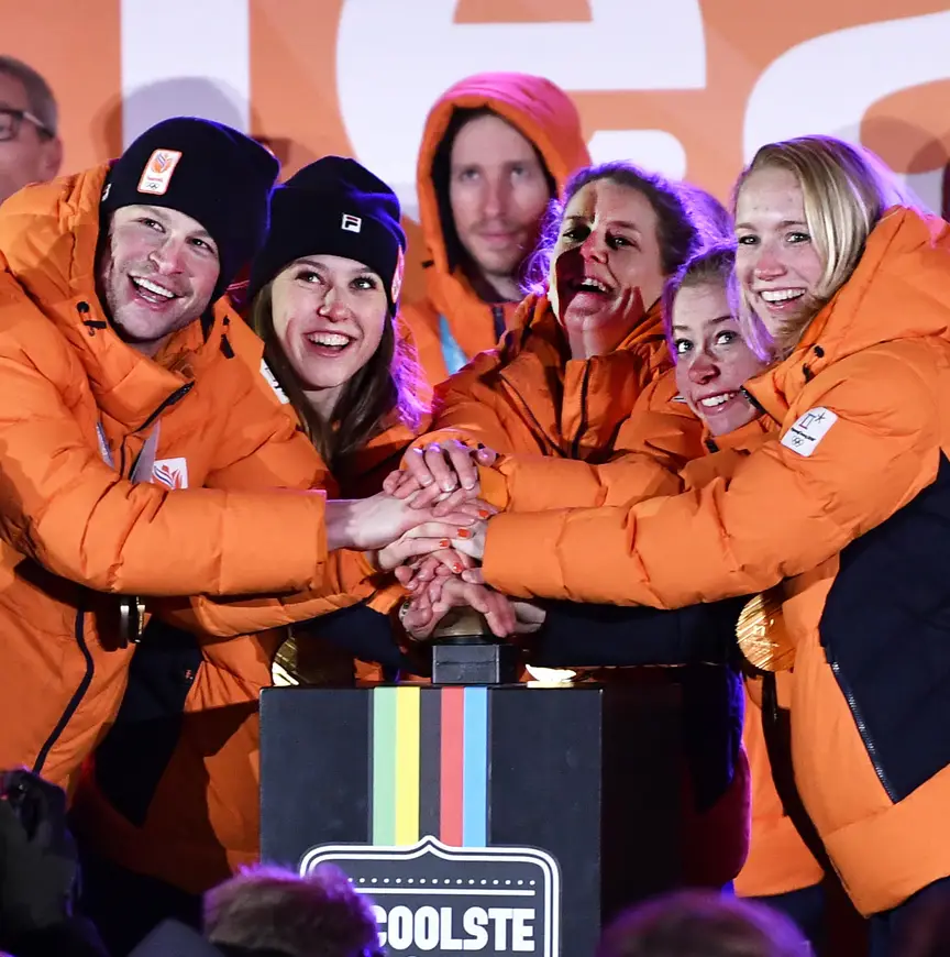Vanwege de straffe wind deed De Coolste Baan haar naam eer aan. In warme oranje jassen stonden de atleten de pers te woord. Langs de boarding van de ijsbaan hoopten de Oranjefans een glimp op te vangen van hun helden. "Het is onwijs mooi dat er zoveel mensen op onze huldiging afkomen", zegt Patrick Roest terwijl hij over de baan uitkijkt. Zijn zilveren en bronzen plakken hangen blinkend om zijn nek.