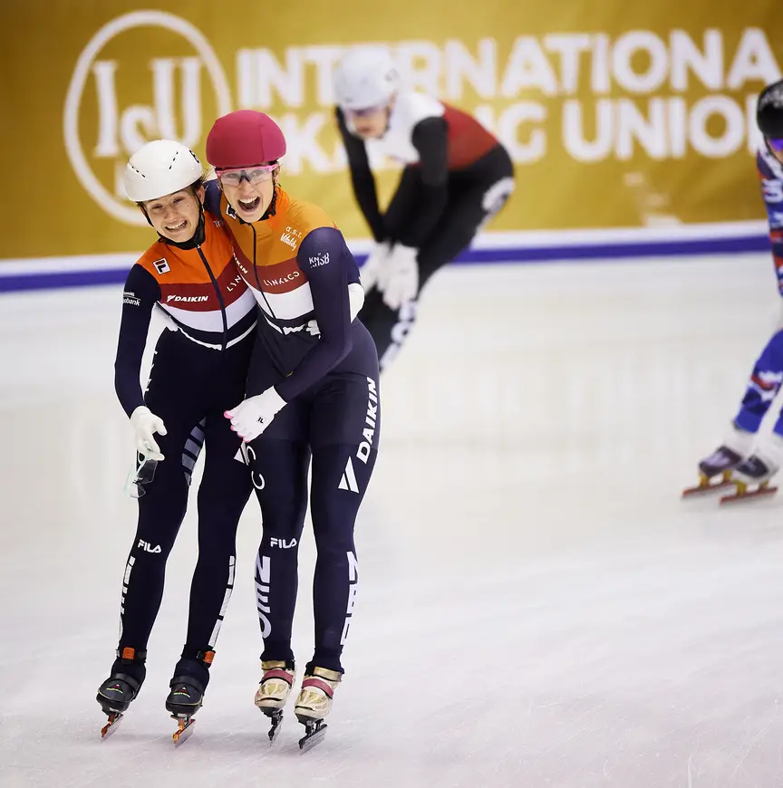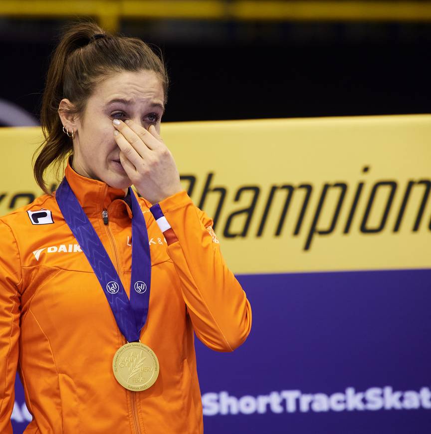Een jaar geleden raakte Schulting na het behalen van haar Europese titel geëmotioneerd door het besef hoe snel was gegaan met haar. Vanuit Polen praat de Friezin nu ontspannen en opgewekt over haar historische derde titel. "Ik heb laten zien dat ik de druk aankan. Druk die ik mezelf opleg, maar ook de druk die anderen mij opleggen. Ik rijd weer een weekend zonder fouten in het individuele toernooi. Dat is volgens mij een mooi gegeven." Toch was ze even daarvoor in tranen tijdens de medailleceremonie. Het werd de 23-jarige shorttrackster even te veel. "Het was de ontlading na zo'n toernooi, maar ook frustratie over de relay. Een mengelmoes aan emoties." Schulting moest vooral ook denken aan Lara van Ruijven, die vorig seizoen in Hongarije nog naast haar stond op het podium na de 1000 meter.